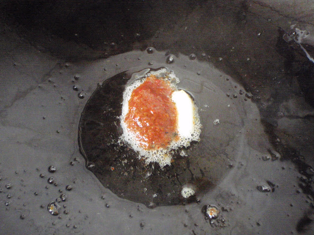 🔥火をつけてフライパンに油を馴染ませ豆板醤、ニンニク(チューブ)を入れて