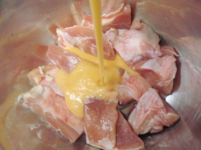 🐔鶏もも肉1枚を一口大に切り分けて、溶き卵(1個)を入れて揉みこんだらボウルごとラップして冷さ蔵庫で一時間寝かせる。