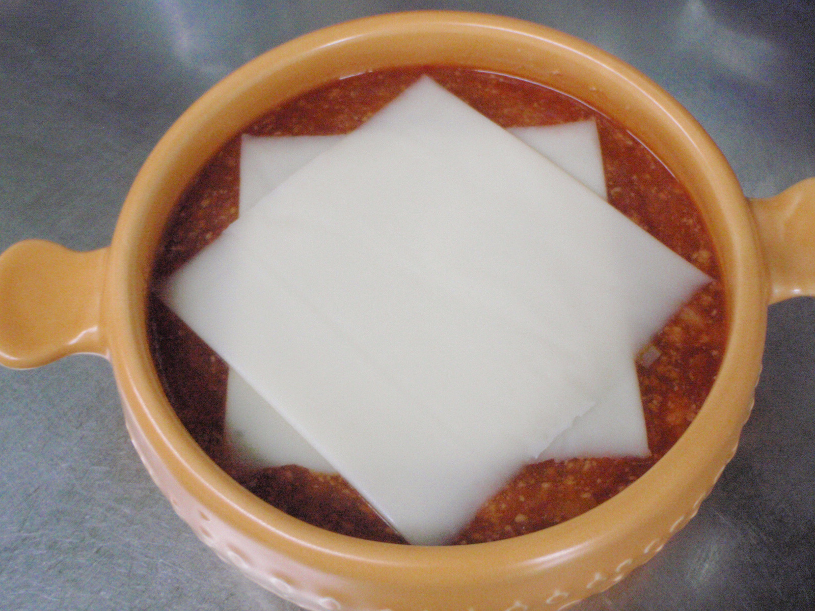 その上にとろけるチーズを入れて、一度鍋ごと火にかけてチーズをトロトロに溶かした後、仕上げにドライパセリを振って卓上コンロに乗せる。