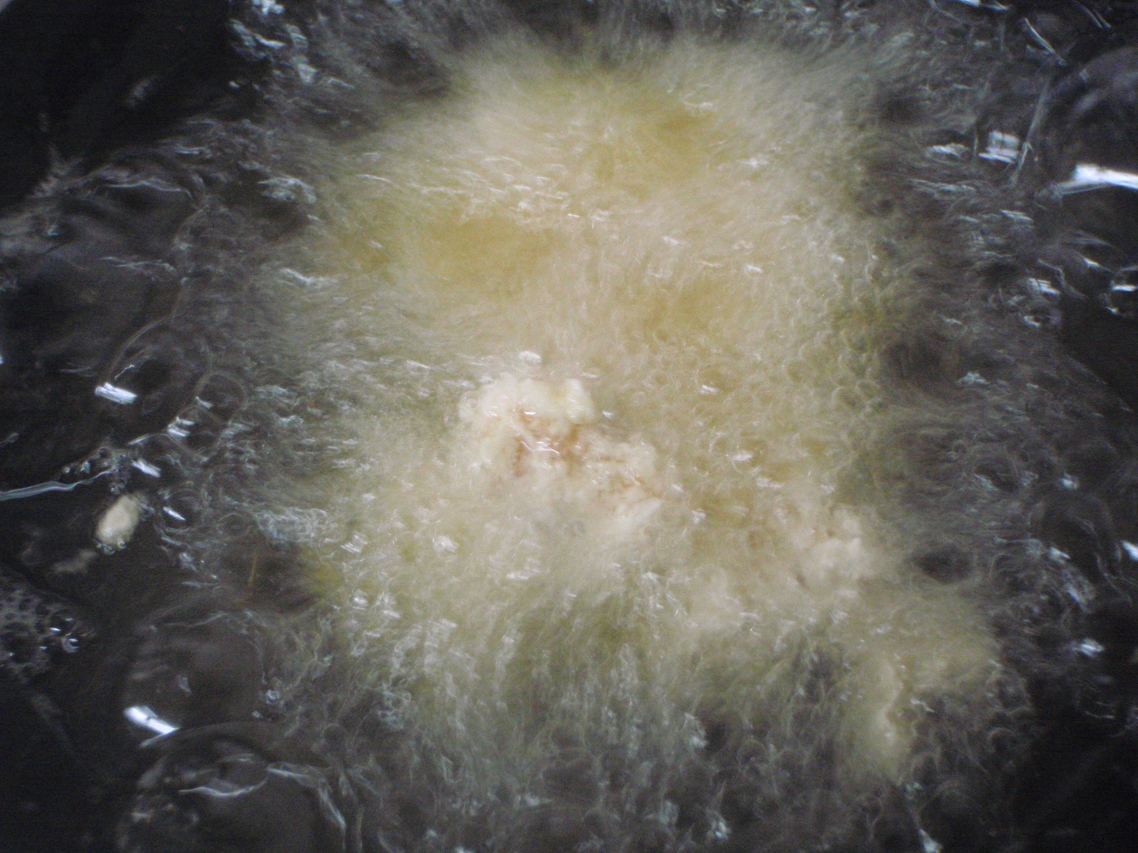 最初に油に入れた肉が沈んでから、しばらくして油面に浮いてきたら火が通ってる証なので、あとはきつね色に色付くまで揚げたら取り出す。