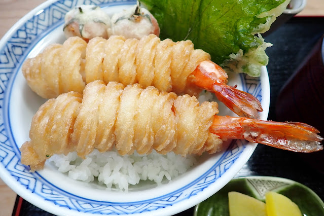 丼にご飯をよそって、チュロス海老天を乗せ、後ろのスペースに青紫蘇天ぷら、プチトマト天ぷらを盛ります。