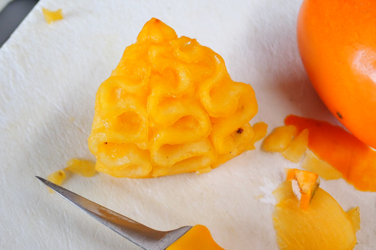 まぁ、他のデザインのカービングでもいいですし、カービングしないならば切った柿に直接グラニュー糖を振りかけてからバーナーで炙ります。